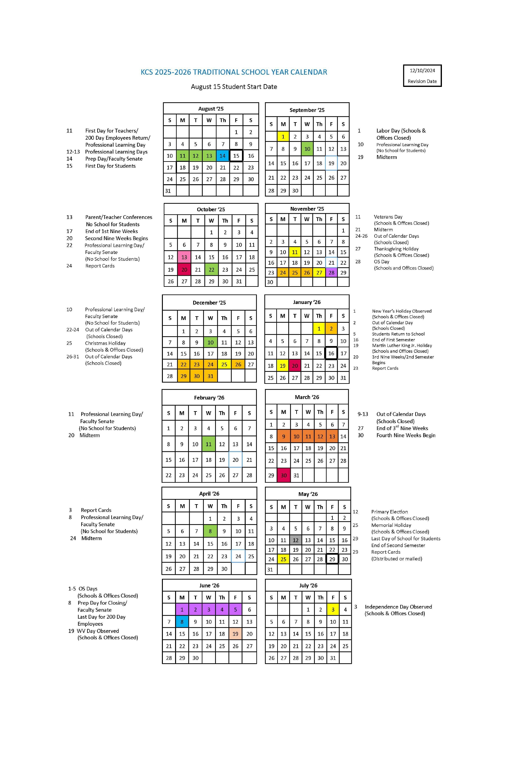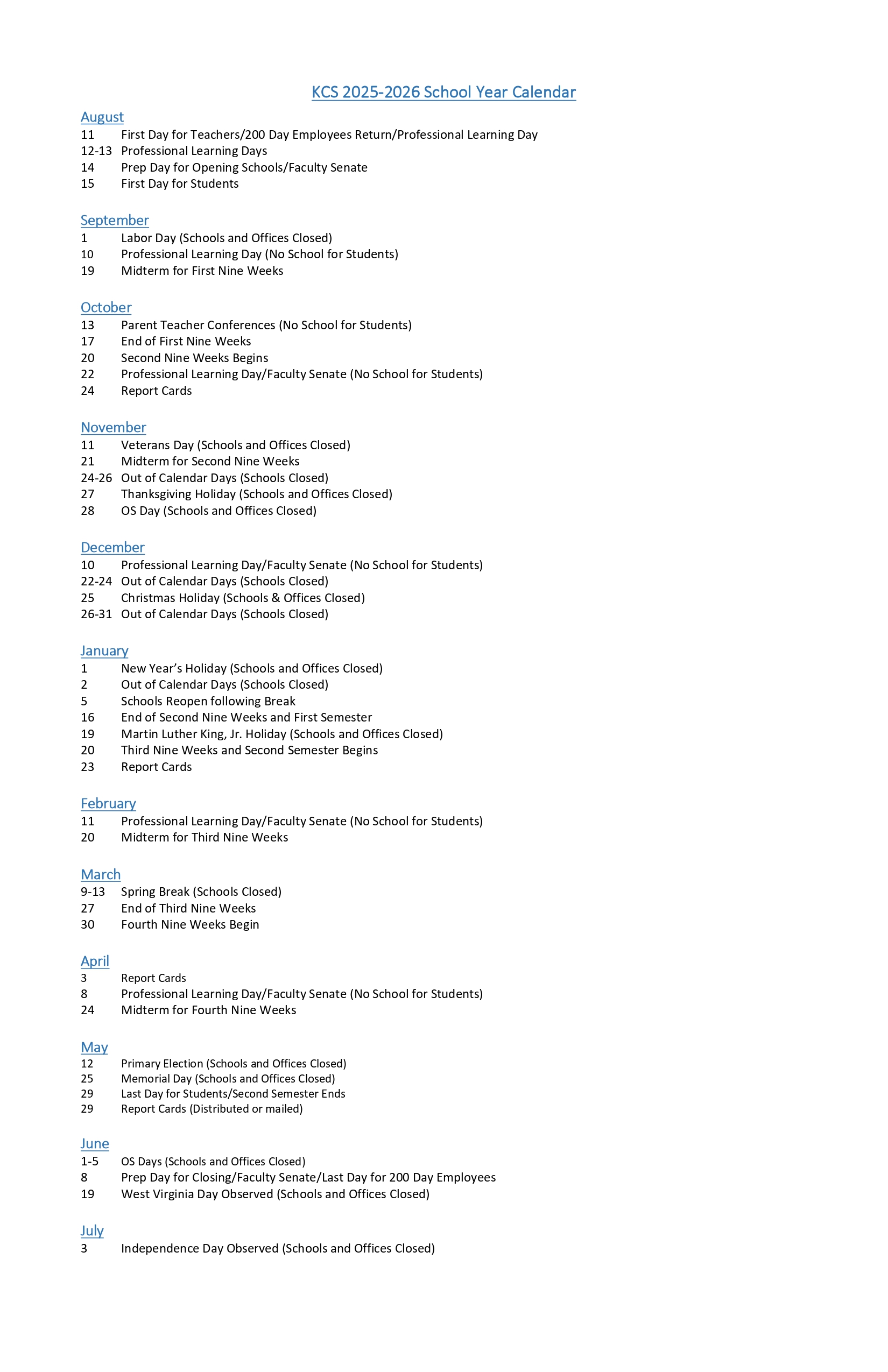 Kanawha County Schools Calendar is a public school district in Kanawha County, West Virginia. The district follows a traditional academic calendar, with students attending school from August to May, and breaks throughout the year for holidays and vacations.