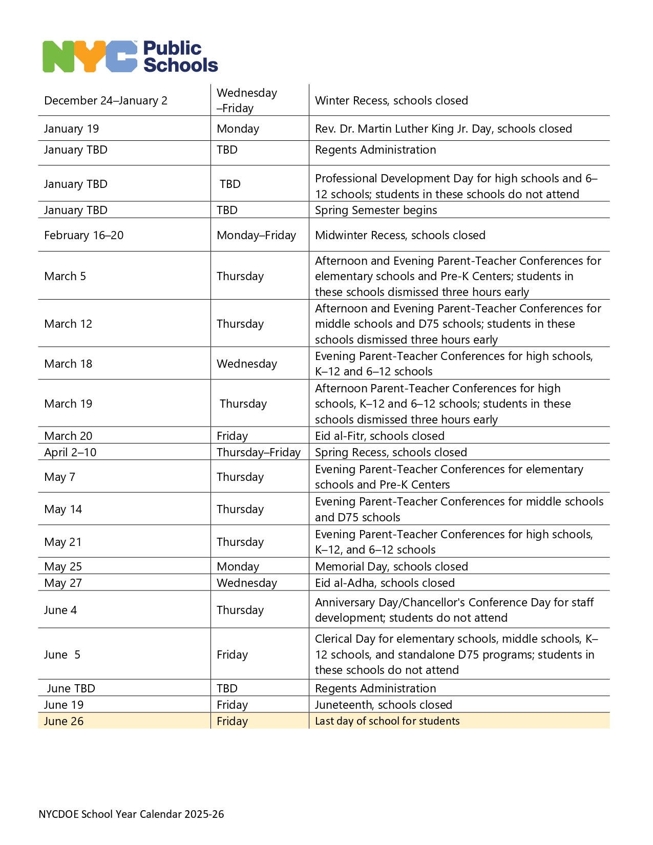For the 2025-2026 school year, NYC public schools’ last day is June 26th, 2026.