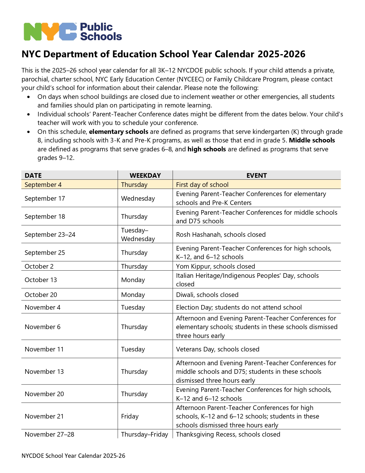 NYC Public School Calendar 2025-2026