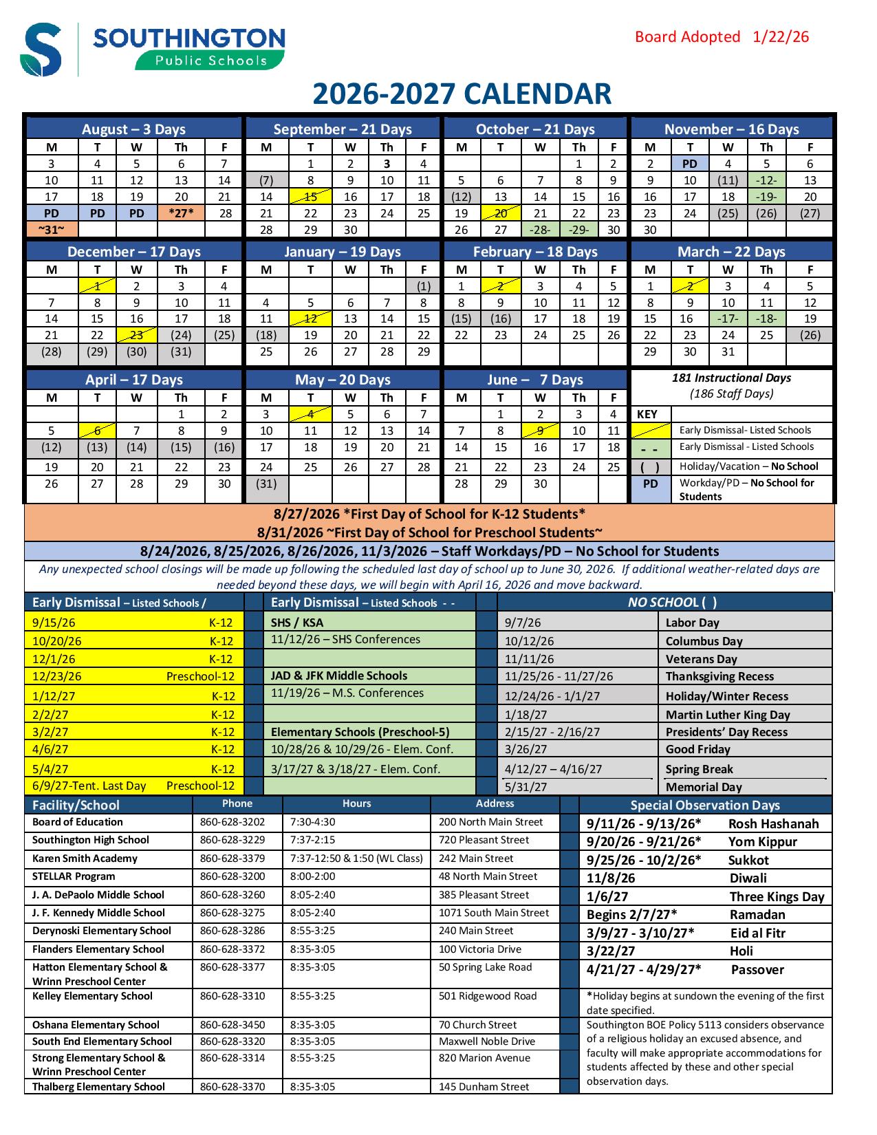 Southington Public Schools Holidays 2026-2027