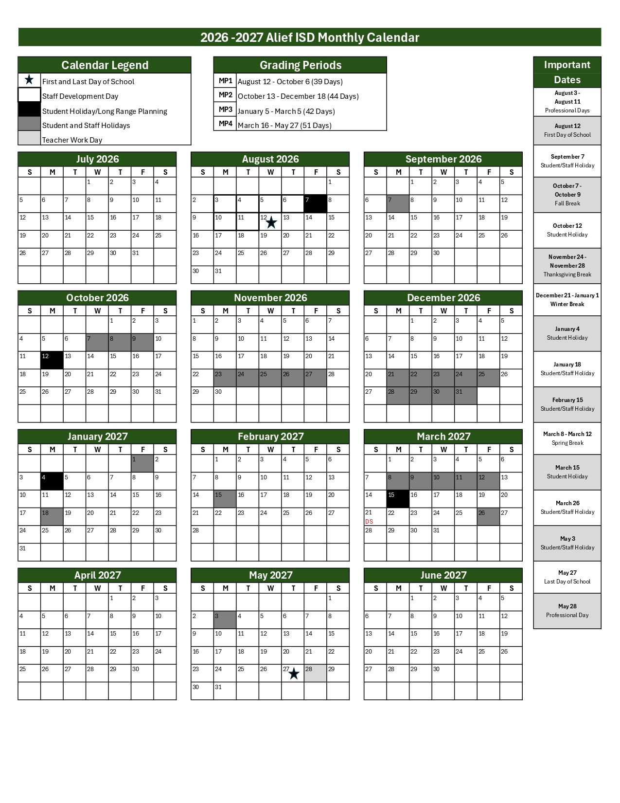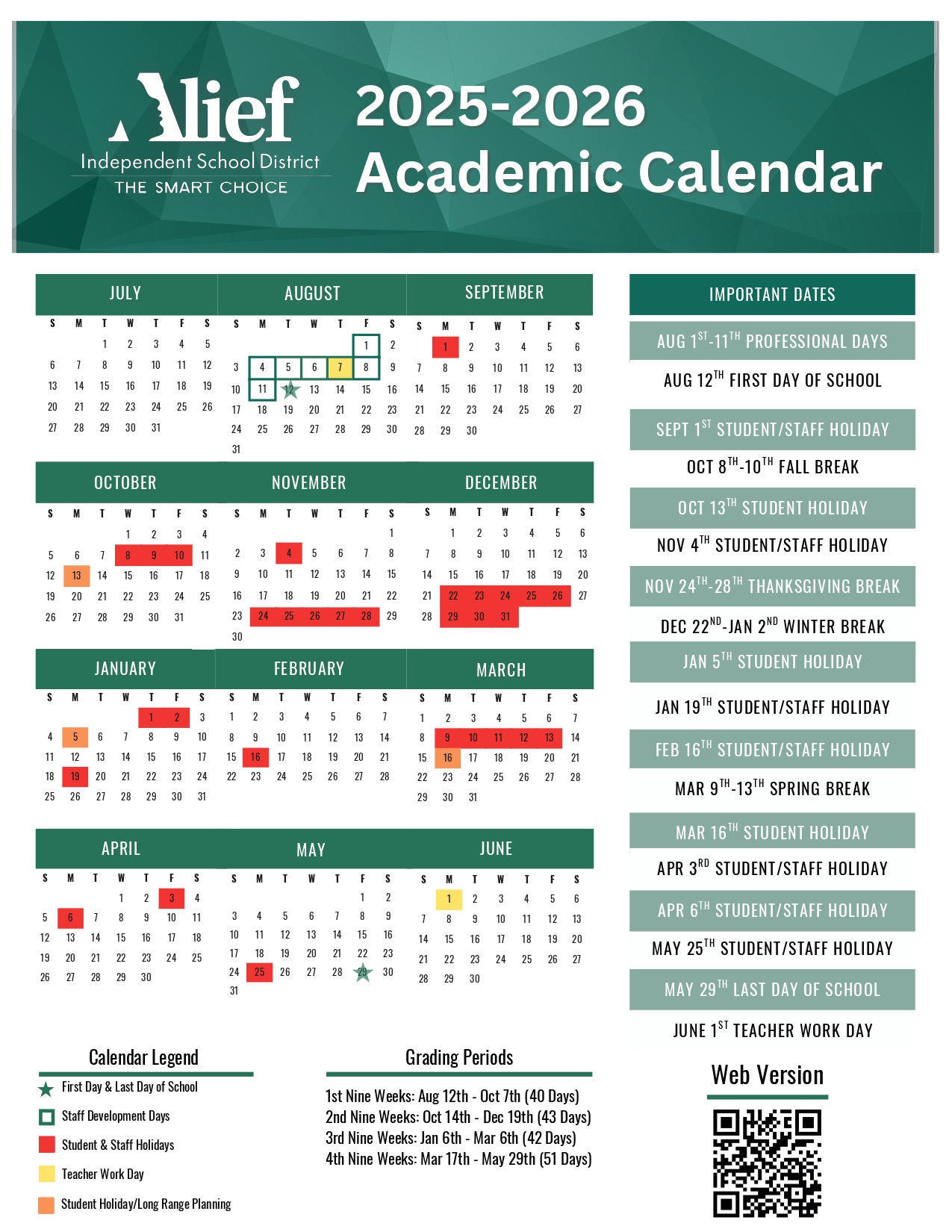 The Alief Independent School District Calendar is a prominent educational institution serving the community of Alief, located in the western region of Houston, Texas.
