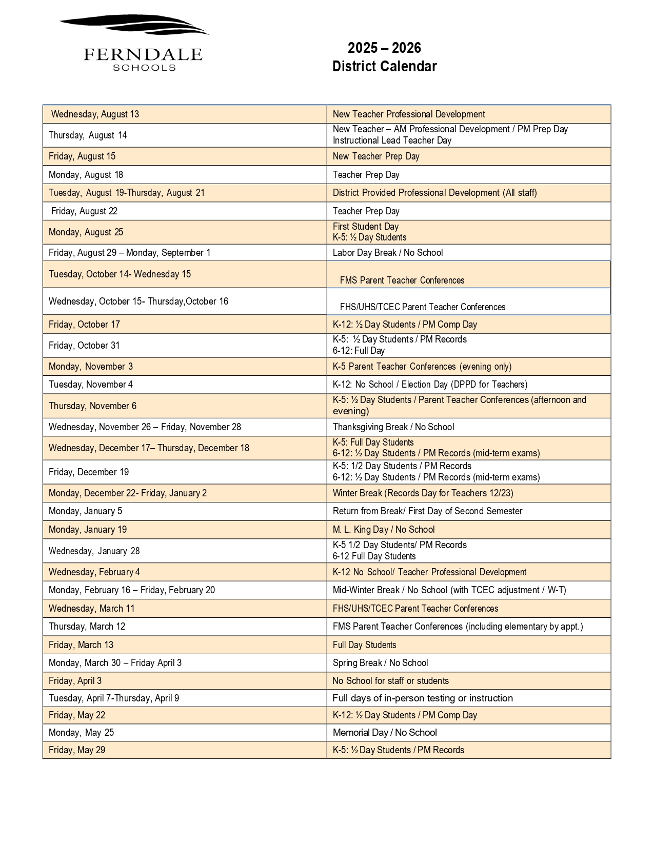 Ferndale Schools District Calendar 2026